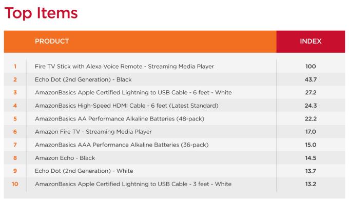 该报告还研究了个人的SKU值,看自营商品中的哪件单品是最畅销的。数据显示,带有Alexa Voice Remote的Fire TV Stick 登顶,其次是黑色的Echo Dot音箱,随后的很多产品都是来自AmazonBasics 的。而黑色的亚马逊Echo和白色的Echo Dot,则分别排在第8位和第9位。在下面的排名中,Echo设备的表现并不是很亮眼,但该产品曾是今年Prime Day的最畅销产品。