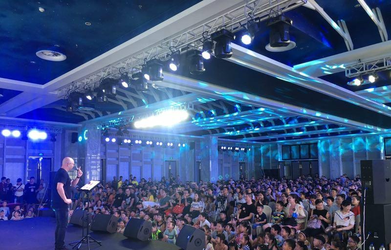 父母带着孩子坐在大礼堂里,听《厨房里的电子乐队》、《听凯叔讲故事》、《小胡子老师的敲击魔法课》、《到大山里去唱歌跳舞》、《当爱尔兰音乐遇见踢踏舞王子》等与亲子相关的一系列互动课,并实时与讲课人通过跳舞、玩游戏等方式进行互动。