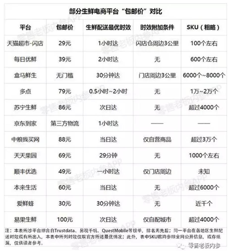 仅SKU一项,平台之间甚至相差高达约300倍。当然,这里需要解释的是,由于各平台打法不同,品类也千差万别,比较的意义并不大。比如盒马鲜生系新零售标杆案例,尽管配送时效很快,但其线上业务覆盖范围非常有限,仅辐射门店周边3公里,跟一些覆盖全国大部分地区的生鲜电商相比,还是处于明显劣势。《零售老板内参》APP(微信ID:lslb168)粗绘该张表格,也仅是为从平台包邮价的角度,尝试探索其中的一些门道。