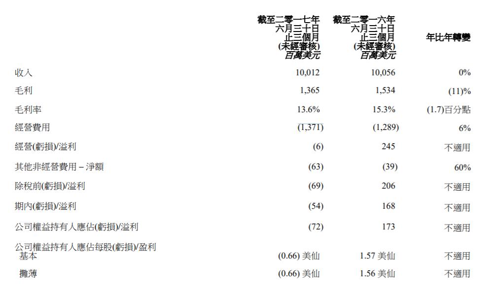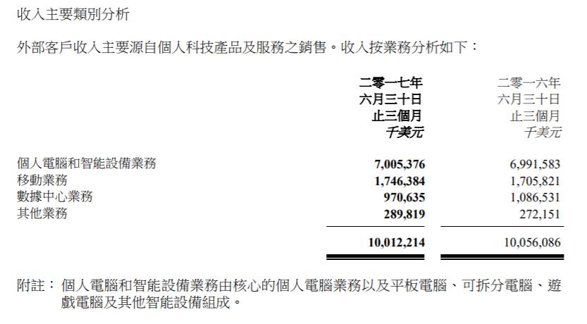今日早间,联想集团在港交所公布了公司2017年第一季度(截止6月30日)业绩报告,财报显示,联想报告期内收入为100亿美元,与上年同期相比持平,若撇除汇率因素影响则增长1%;亏损7200万美元,上年同期为盈利1.73亿美元;每股亏损0.66美仙。