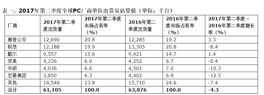 Gartner数据显示,2017年第二季度全球个人电脑(PC)出货量共计6110万台,较2016年第二季度下滑4.3%。PC产业已连续5年处在低潮期,出货量则连续11个季度出现下滑,这也是自2007年以来出货量最低的一个季度。