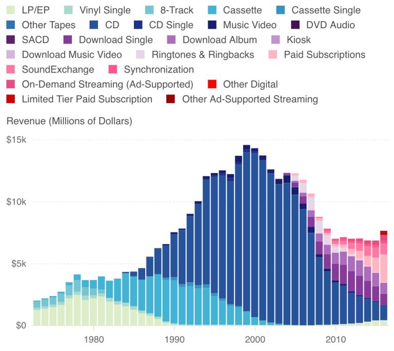 付费订阅(桃红色),卫星及互联网广播(SoundExchange,粉色)现在的收入流已经高于付费购买音乐。来源:RIAA