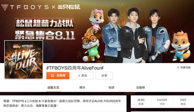 3.网络上的影响力大。流量歌手在网络上对于流量的吸引效应,顺应了其自身价值的产生逻辑。像是本次TFBOYS四周年演唱会,话题“TFBOYS四周年Alive Four”在微博话题共吸引了16.9亿次的阅读和1117.2万次的讨论,而在演唱会直播的过程中,粉丝共送出3.4亿个礼物。