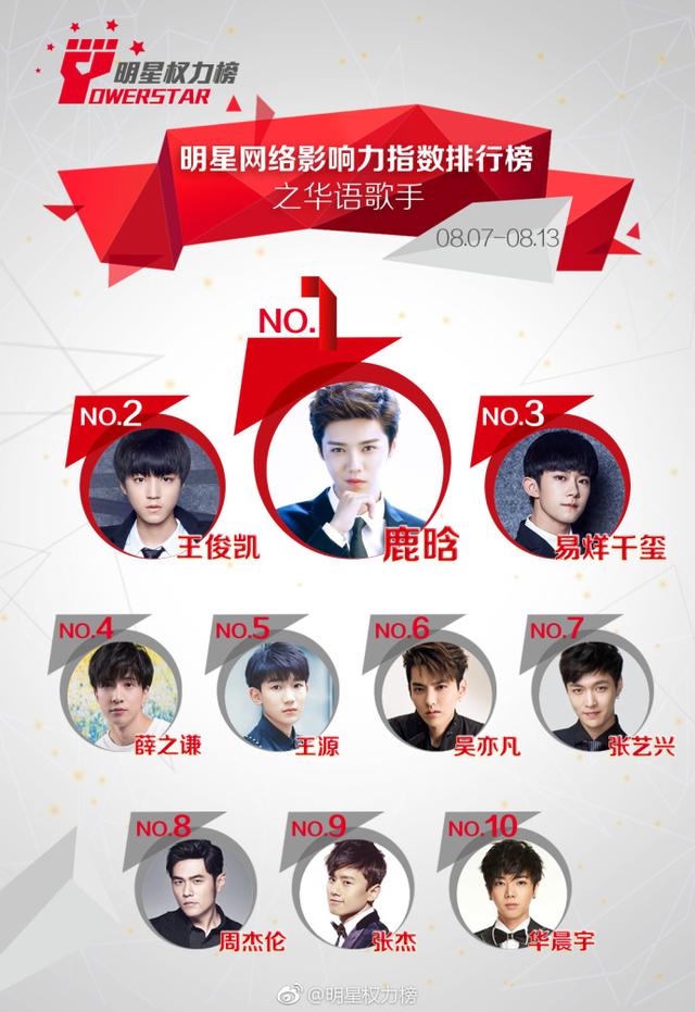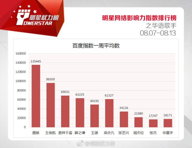 另一个值得注意的是,这10位歌手几乎都来自于传统唱片工业体系或电视选秀时代,而没有一个互联网圈层文化之下的造星结果。但下面的一组数据,则展现了不一样的行业景象。根据明星权力榜统计的一周百度指数,除了周杰伦、张杰,其他8位均成名于互联网圈层时代之下,且大多数为“90后”。