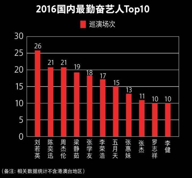 根据微影的《2016音乐演出市场年报》,2016年内地共举办演唱会1863场,较2015年增长了9.3%;同时举办音乐节超200场。而在演唱会场次TOP 10的歌手里,港台地区的歌手占到7个,仅有李荣浩、张杰、李健3人来自内地。