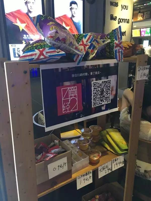 我们把一个无人货架放到了楼下的电影院门口。上面放了饮料和零食。