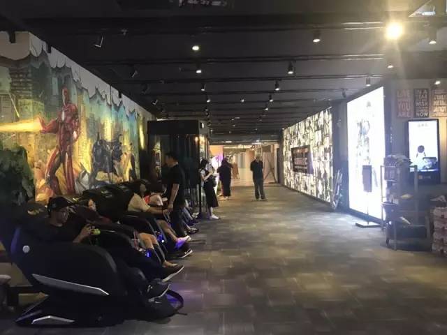 影院的门口有无人按摩椅、共享充电宝、无人 KTV、抓娃娃机等等,我们的无人货架在右手边的位置。