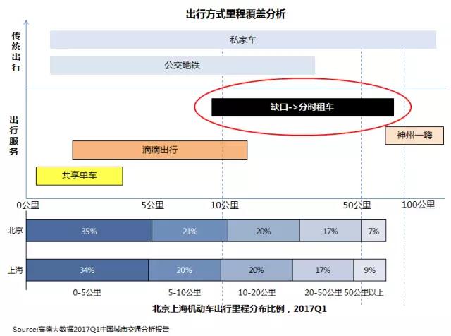 庖丁解牛,我们把出行服务按照距离长短分开看,根据高德大数据的显示,北京上海两个城市0-10公里的出行需求占总盘子的55%,10公里以上的需求占45%。再看供给,共享单车解决的是0-3公里的公共交通接驳需求,滴滴+出租车解决的是0-10公里的短途直达出行需求,神州租车解决的是100公里以上中长距离用车需求,而占据45%比例的10-100公里出行需求完全没有一个对应的供给。