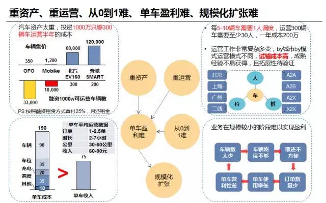 2015年我在百度战略部的时候就开始关注分时租赁市场,当时觉得在滴滴已经垄断出行用户端的情况下,分时租车是唯一可能突破的出行机会,但看完一圈之后结论极为负面,无法单车盈利成为行业瓶颈。朱啸虎同志说重资产适合做C2C(滴滴),轻资产适合做B2C(OFO),这两种模式都能让业务保持快速的增长,垄断市场。而汽车分时租车恰恰是重资产+B2C+重运营。汽车的成本是单车的200倍,铺3万辆OFO的钱只够铺300辆汽车,另外除了简单的铺车还要考虑停车位、充电桩、车辆调度、充电、维修等一系列运营问题。反映在具体的商业模型上,在成本端:一辆车的成本在8-12万左右(汽油车五年折旧,电动车三年以下),一二线城市停车位成本在600-1200之间(平均每辆车对应1-1.5个停车位),一个月工资5000元的员工调度3-5辆车,核算下来平均每天单车成本约在180-230元左右。在收入端:平均每天单车行驶1-2.5单,30-60公里,收入60-90元 。上面的数据是2015-2016年的行业中位数,可以看出在那个时间点,绝大多数的公司都无法实现单车盈亏平衡,商业模型不成立,自然无法规模化扩张了。总结一句话,两重三难:重资产、重运营、从0到1难、 单车盈利难、规模化扩张难。