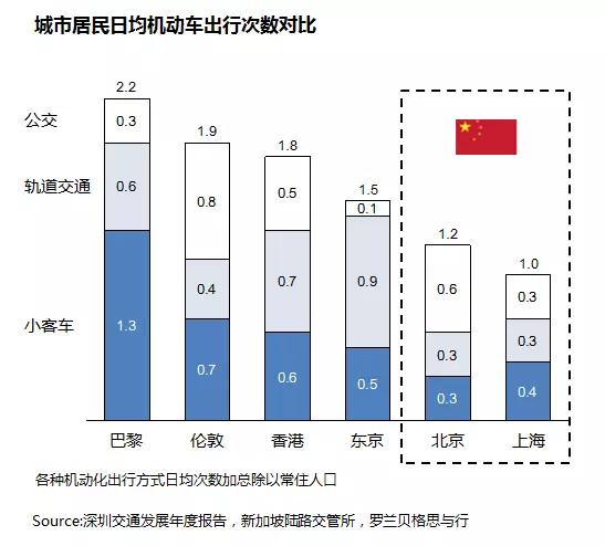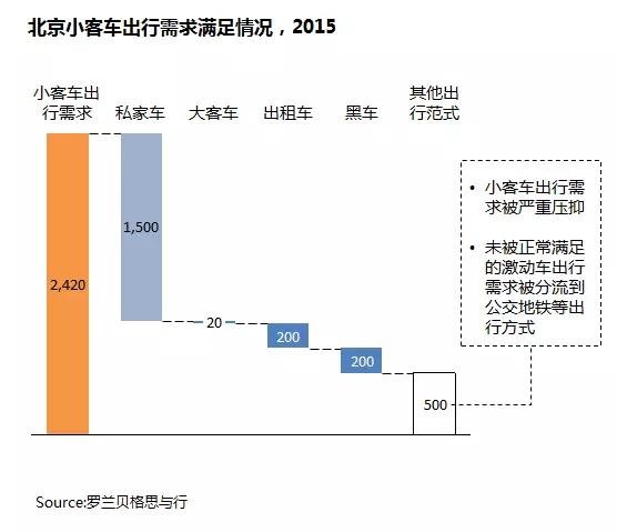 根据罗兰贝格咨询公司2015年调研显示,中国居民的日均机动车出行的次数要远远小于发达国家,极大的限制着人民就业生活消费的进一步提升。以上海为例,上海如果要达到香港目前的机动化出行水平,现有运力需要再提高约70%。再以北京为例,刨除步行、单车、公交、地铁等出行方式,北京每天小客车的出行需求2420万人次,其中有1500万人次是私家车,出租车+黑车400万次,剩下约500万次因为没有私家车或者打不到车被迫坐地铁和公交。究其原因,中国当前的人均汽车保有量为1/10,而同比美国达到8/10,私家车的供给差距太大。同样运营车辆的供给也是杯水车薪:北京市出租司机+快车司机+专车司机月活数量30万,日活15-20万,日订单量在100-200万之间,只占到总体出行出行需求2420万人次的5-10%。