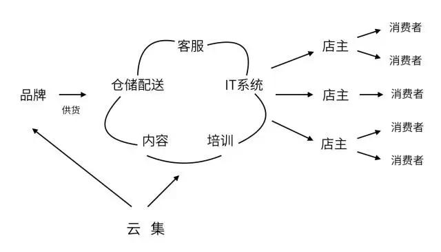 “云集”目前在这点上的创新相对比较突出。S 是云集集成的一张大服务网络,包含六朵云,即精选式采购(面向升级消费需求,买手精选 3000 多种品牌商品,对品质做到更为严苛的掌控)和平台化支持(平台集成多种零售服务资源,如仓储配送,客服,内容,培训,IT系统等,提供全方位的商业支持,降低店主参与网上零售的门槛),通过这六朵云的支持,赋能 小b 即个人店主,个人店主利用社交工具(i.e.,微信群)传播商品信息并进行售前和售后服务,可以说小 b 部分代替了传统广告媒介和渠道,借助个人信用,服务于c即消费者。