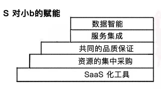 S平台赋能小b的第二个重要的方面,也是一个重要的价值点,就是提供小b都共同需要的某些服务。因为小 b 缺乏对上游供应商的谈判能力,往往不能获得很好的资源支持,但是由于 S 完成了小 b 的在线化支持,所以他们可以实时准确地获取小 b 对某些公共服务的需求,帮助他们向上游供应商集成采购,获得更好的价格和服务。