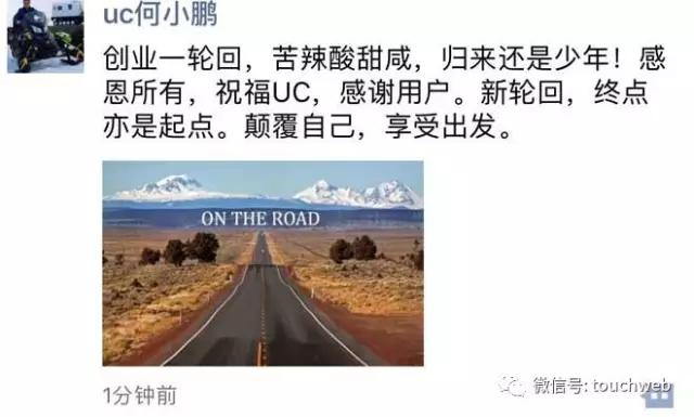 何小鹏说,创业一轮回,苦辣酸甜咸,归来还是少年!感恩所有,祝福UC,感谢用户。新轮回,终点亦是起点。颠覆自己,享受出发。