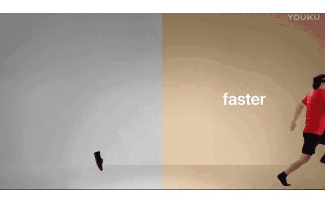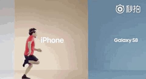 虽然是三星的广告,但广告的背景仍然采用了苹果「Why Switch」主题广告中的极简风格。在宣传 Galaxy S8 5G 网速的广告中,甚至直接把苹果广告中的一则广告照搬了过来,在苹果的广告中,一个男人从画面左侧的慢动作到画面右侧的飞奔,苹果想用这种变化告诉用户们 iPhone 运行速度有多么畅快。