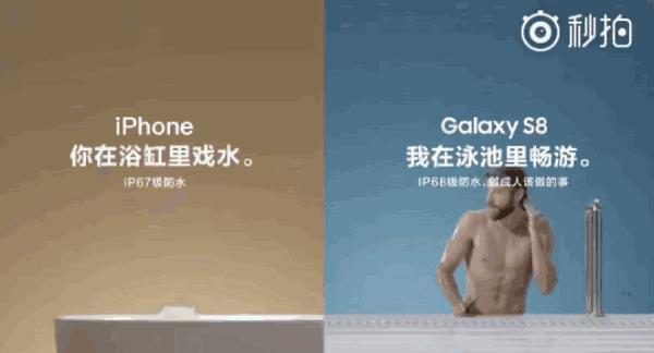 在另一则广告中, Galaxy S8 则调侃 iPhone 的 IP67 级防水是「在浴缸里戏水」,而自己的 IP68 级防水则可以在泳池里畅游。