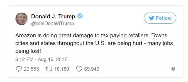 一波未平一波又起,一向喜欢以“Twitter治国”的Trump又将炮火怼向了Amazon。他斥责Amazon伤害了那些缴税的实体零售商,让很多美国人失去了工作。此推文一发,Amazon股价应声下滑,当天市值缩水50亿美元。