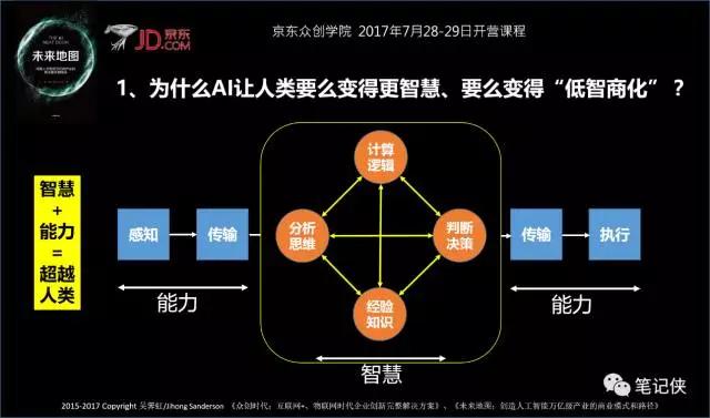 你看,今天技术可以把我们原来的“存储、处理、决策”产生智慧的这三件事情,分解成计算逻辑、判断决策、经验知识、分析思维的闭环AI系统(算法、软件),代替人类决策。人类的其他感知、传输、行动,其实就是我们讲的能力。
