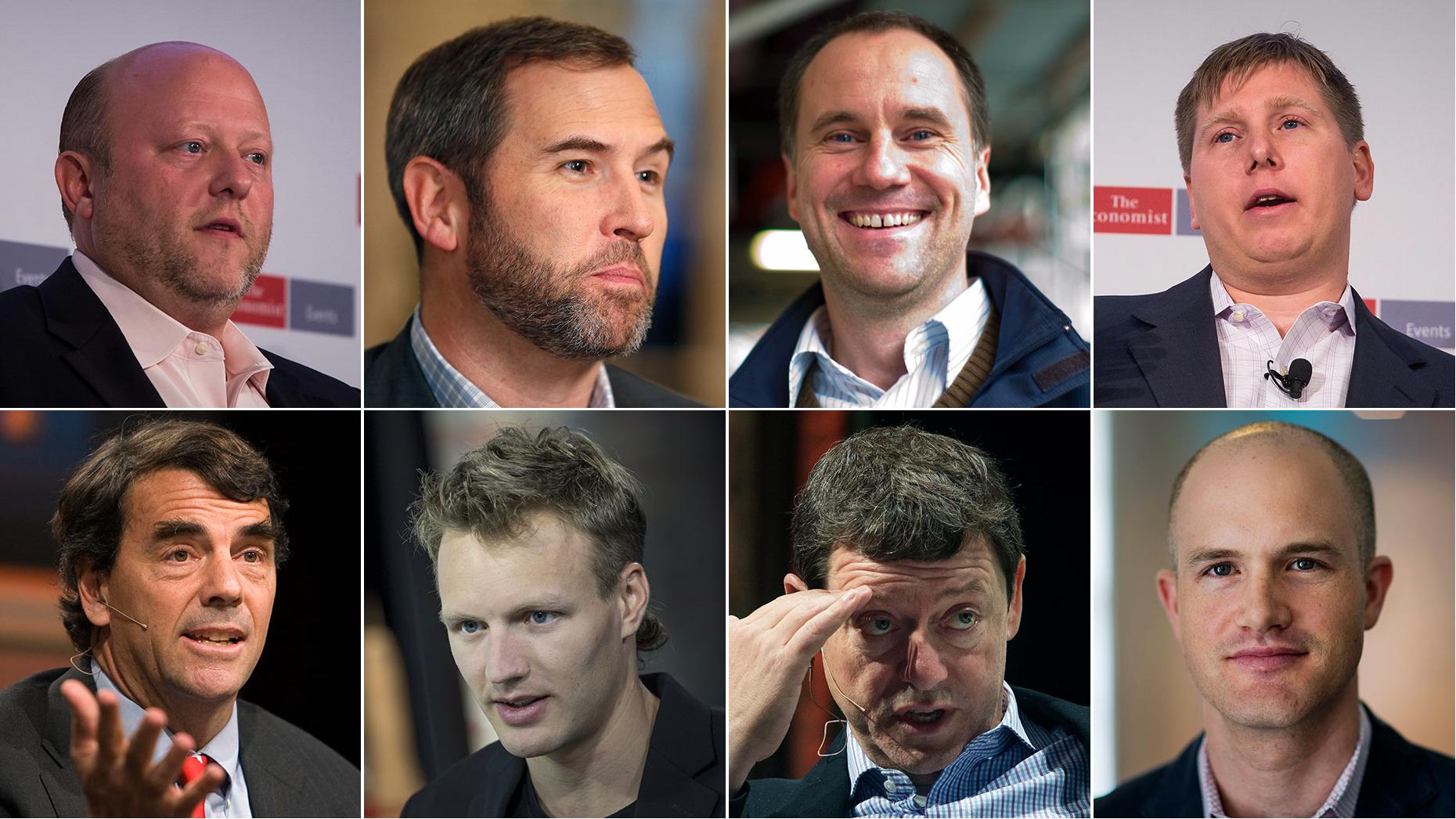 从左上开始依次为Jeremy Allaire, Brad Garlinghouse, Albert Wenger, Barry Silbert, Brian Armstrong, Fred Wilson, Olaf Carson-Wee, Tim Draper