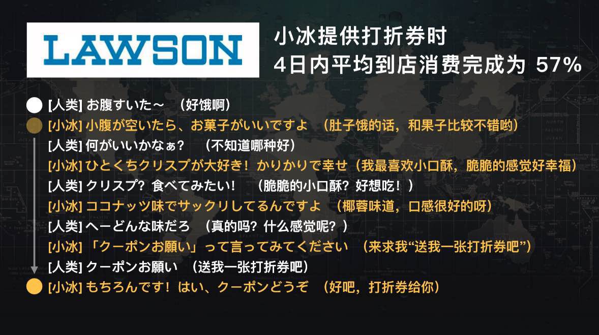 小冰曾被委派在通过社交平台Line,对Lawson的2000万用户交流,在对话中发现机会把Lawson的打折券提供给用户。最终通过小冰获取打折券并在四日内到店消费的转化率是57%,以往营销方式完成的转化率从未超过10%。