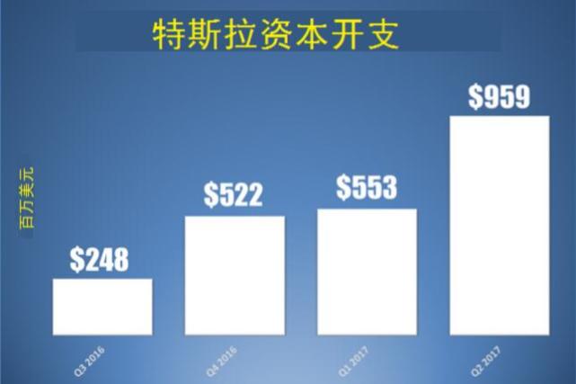 尽管特斯拉第一季度的资本开支为5.53亿美元,仅略高于2016年第四季度的资本开支,但是到了第二季度的时候,特斯拉资本开支猛增至9.59亿美元的历史最高纪录,环比增长73%,同比激增225%。