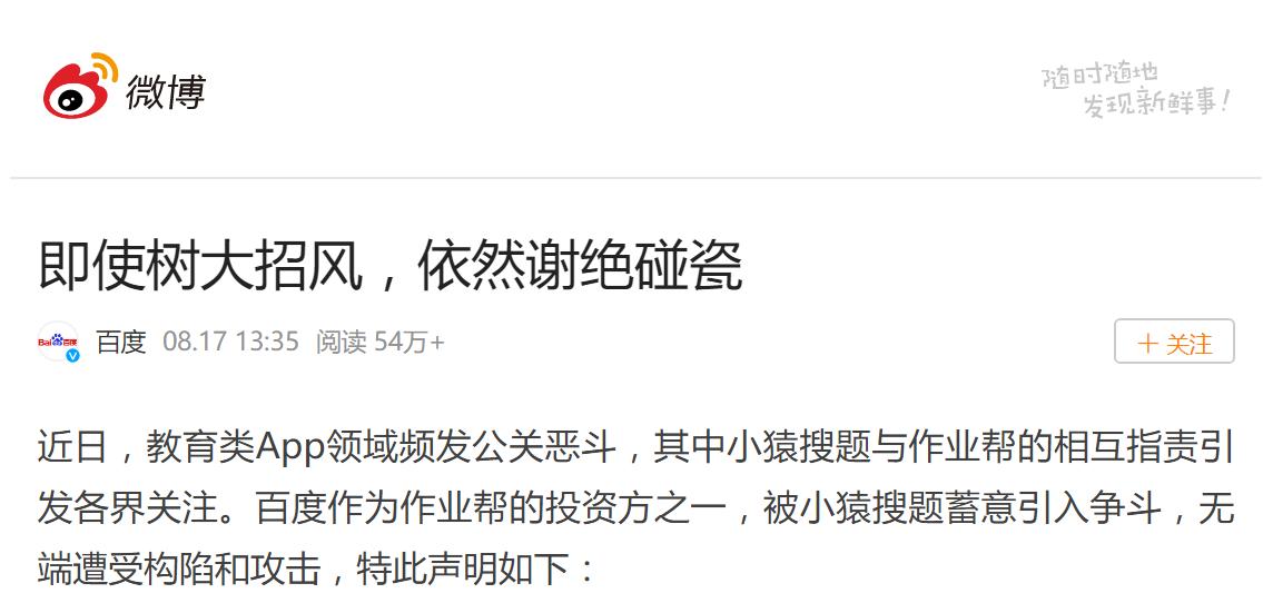 针对此事,8月17日,百度发布官方声明《即使树大招风,依然谢绝碰瓷》称,作业帮是拥有独立品牌、完全自主经营的企业实体,百度作为投资方之一,不参与作业帮日常运营,更从未以任何形式参与此次小猿搜题与作业帮的争端,但却遭到粉笔蓝天科技有限公司(粉笔网)CEO张小龙及部分营销大号在媒体平台上的肆意攻击和诽谤。