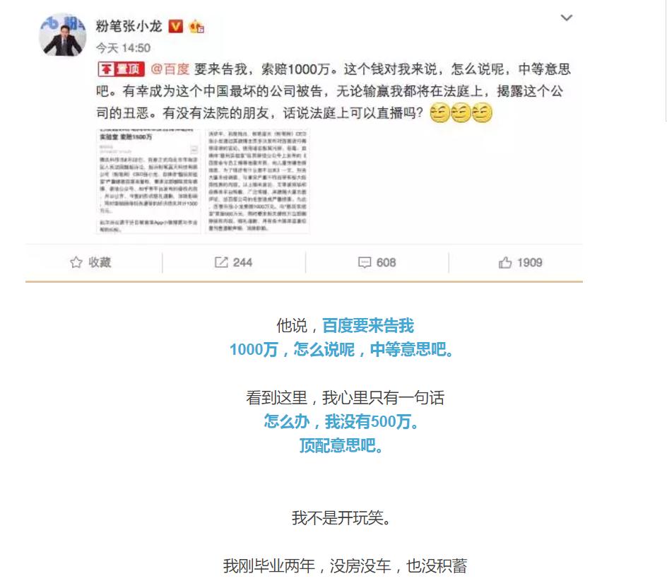 粉笔网张小龙在微博上表示向他索赔1000万就是中等意思,酷玩实验室在当天发布文章回应《我就是那个骂百度的公众号。百度向我索赔500万,但是我没有500万》,次日公众号三表龙门阵发文《三表:百度让你赔500万可真心不冤》。