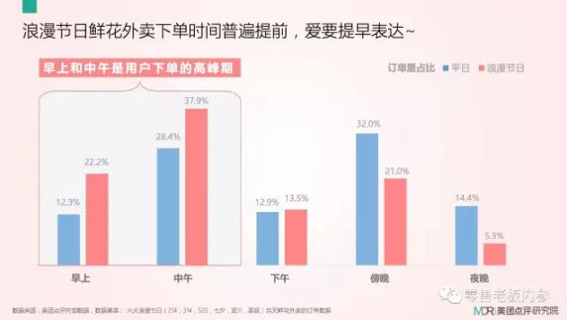 具体时间点上,浪漫节日鲜花外卖下单时间普遍提前,早上和中午是用户下单的高峰期,其中中午浪漫节日鲜花订单量最高,占比为37.9%;如果是平时,傍晚则是鲜花外卖下单高峰期,订单量占比为32.0%。
