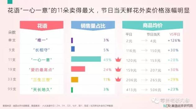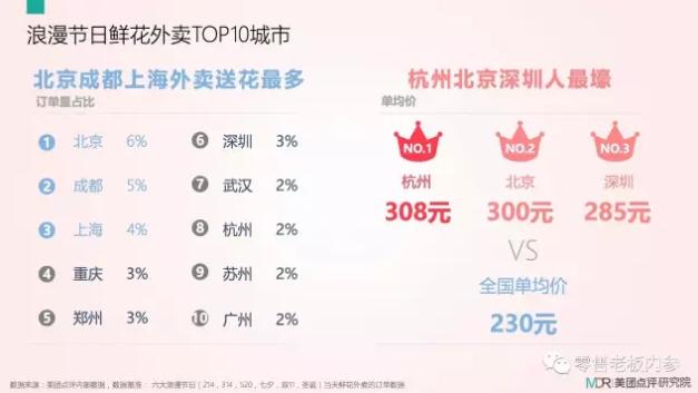 根据美团点评研究院数据,花语“一心一意”的11朵卖得最火,销售量占比为49%。节日当天鲜花外卖价格涨幅明显。北京、成都、上海等三个城市位列外卖送花TOP3,杭州、北京、深圳三个城市单均价分列前三,分别为308元、300元、285元,远高于全国单均价230元。