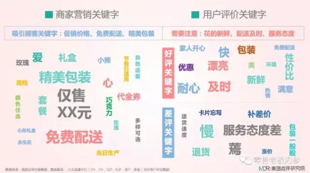 《零售老板内参》APP(微信ID:lslb168)注意到,为了吸引消费者,商家们营销起来也是不遗余力。吸引顾客的关键词为促销价格、免费配送、精美包装;与之相对,商家们需要特别留意的用户评价关键词则为花的新鲜、配送及时以及服务态度。