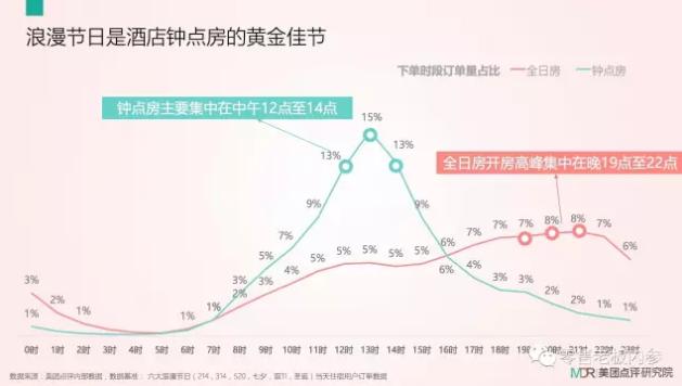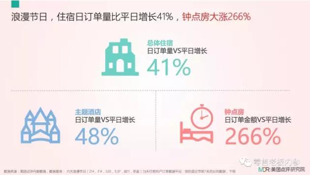 吃喝玩乐了一整天,找个舒适的酒店睡觉是情侣们制造浪漫的首选收尾方式。根据美团点评研究院数据,浪漫节日,住宿日订单量比平日增长41%,主题酒店日订单量较平日增长48%。最为惊艳的是钟点房数据,日订单金额较平日暴涨近266%。如此夸张的涨幅背后,不难看出浪漫节日钟点房的需求旺盛程度。