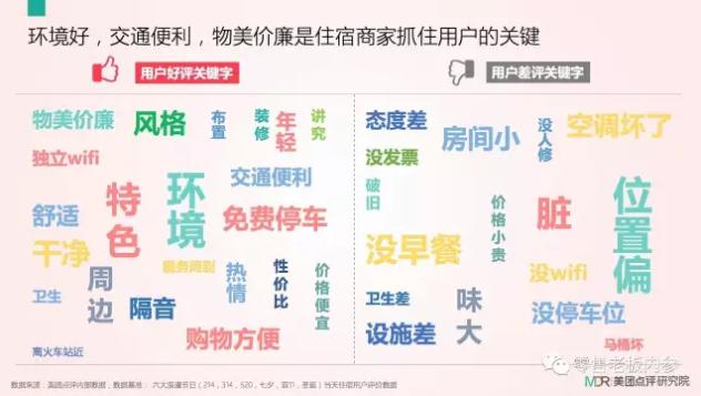从用户评价来看,环境好、交通便利、物美价廉是住宿商家抓住用户的关键。