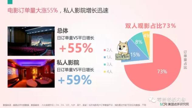 与恋人相约看一场电影是一件非常惬意的事,浪漫节日尤为明显。美团点评研究院数据显示,电影总体日订单量较平时大涨55%,私人影院更受关注,日订单量较平日增长59%;观影群体也是毫无悬念地成为虐狗环节,双人观影占比73%,单人观影仅占15%。