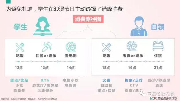 尽管都善于制造浪漫气息,但学生与白领在消费时间点出现明显差异。根据美团点评研究院数据,学生在浪漫节日主动选择了错峰消费。吃饭时间集中在12点,以甜点/饮品、小吃、自助餐为主;住宿/娱乐集中在13点,娱乐方式多为KTV、游艺厅/棋牌室、运动健身等,看电影则集中在14点,会相应买一些电影小吃和电影券;