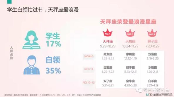 看脸不如看星座。健谈、追求和平的天秤座荣登最浪漫星座冠军,天蝎座、狮子座紧随其后,分列二、三名。订单来源人群方面,由于有固定经济收入,白领人群订单量成最大占比,约为35%;风华正茂的学生党们,也对浪漫经济做出了大量贡献,订单占比约为17%。