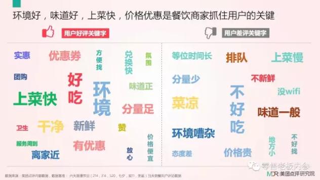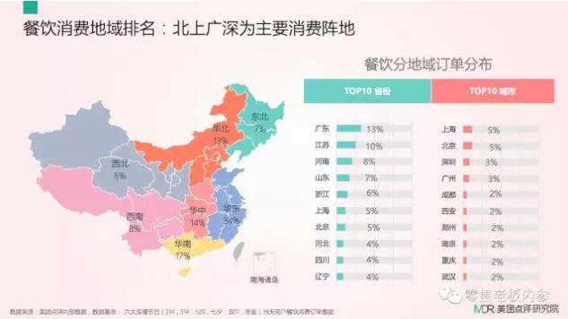 从消费地域来看,餐饮消费TOP3订单省份分别为广东、江苏、河南,TOP3订单城市分别为上海、北京、深圳。从用户评价关键字来看,环境好、味道好、上菜快、价格优惠是餐饮商家抓住用户的关键。