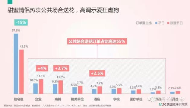 一个残酷的现实是,单身狗在公共场合吃狗粮的几率相比平时更高。根据美团点评研究院数据,甜蜜情侣热衷公共场合送花,公共场合送花订单占比高达55%。其中住宅区订单量占比下滑15%,企业、商铺、机关单位等“虐狗重灾区”订单量则分别上升4%、3.7%、1.2%。
