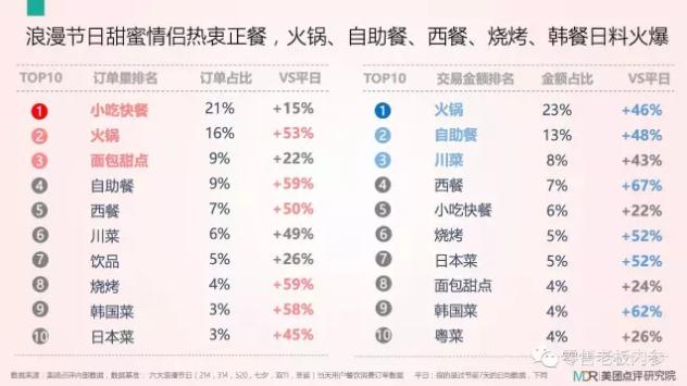 浪漫节日情侣们钟情正餐,火锅、自助餐、西餐、烧烤、韩餐、日料等销售火爆,但论订单量,小吃快餐成绝对主力,位列订单量第一位,订单占比为21%。紧随其后的为火锅、面包甜点,分列二、三名。《零售老板内参》APP(微信ID:lslb168)认为,小吃快餐的脱颖而出,说明浪漫经济里有不少学生群体,且在节日活动中,吃并不是最重要的,只是热身活动。