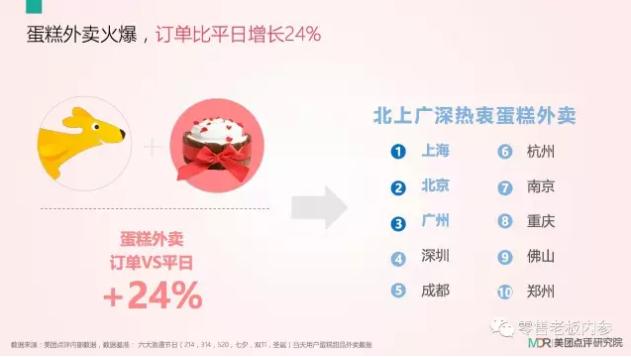 蛋糕外卖市场也迎来火爆行情,订单比平日增长24%。其中,上海、北京、广州、深圳、成都等五座城市最为热衷蛋糕外卖。