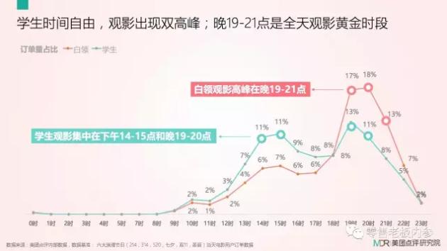 与之前餐饮时间段不同,学生与白领在观影方面呈明显差别。由于学生时间自由,观影出现双高峰,分别为下午14点~15点和晚上19点~20点;白领则仅为单高峰,集中在下班之后的19点~21点。由此可见,晚上19点~21点是全天观影黄金时段。