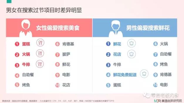 在搜索偏好上,男女之间差异明显。整体来看,过节“吃什么”是女性人群最关心的方向。TOP5搜索关键词依次为蛋糕、火锅、牛排、自助餐、烤鱼,属于当之无愧的吃货“菜单”。男性则善于制造浪漫氛围, TOP5搜索关键词依次为鲜花、花店、牛排、鲜花免费配送及蛋糕等,鲜花成男性“撩妹”神器。