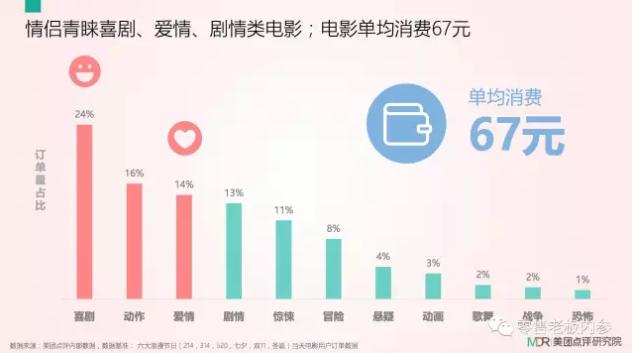 从消费情况来看,电影单均消费67元,喜剧、动作、爱情题材的电影成为兴趣倾向。