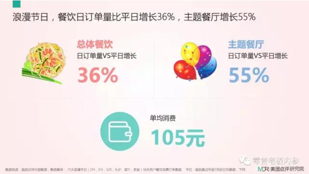 吃是浪漫节日必不可少的元素,餐饮日订单量也呈良好的势头。根据美团点评研究院数据,总体餐饮日订单量较平日增长36%,主题餐厅日订单里较平日增长55%,单均消费105元。