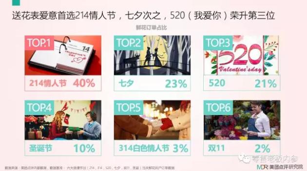 一束鲜花传递一份情。浪漫节日里,恐怕再也没有比向心上人递上一束鲜花更美好的事了。《零售老板内参》APP(微信ID:lslb168)梳理数据发现,在六大浪漫节日里,“以花传情”成214情人节首选,鲜花订单占比达40%;七夕次之,鲜花订单占比约23%;520则荣升第三位,订单占比为21%。