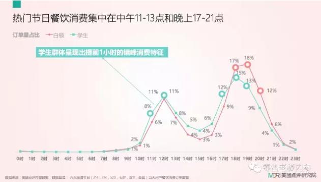 与鲜花不同,餐饮消费时间段呈明显集中化分布。无论是白领还是学生,消费波峰重叠度较高,11点~13点和晚上17点~21点最为密集。但学生群体呈现出提前1小时的错峰消费特征。