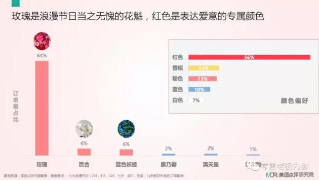 鲜花种类选择上,红色玫瑰一枝独秀,成为浪漫节日当之无愧的花魁。其中,玫瑰占订单量84%。此外,红色成浪漫节日主色调。