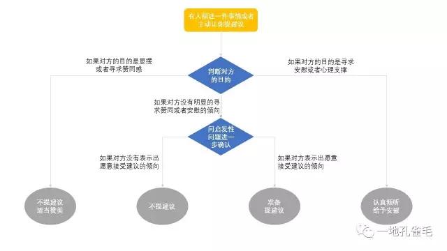 不是任何时候都需要或者应该提建议的,当别人明确征求你的建议的时候,也不见得就是真心寻求建议。按照下图所示,当别人描述一件事情或者主动让你提建议,一般有三种情况:
