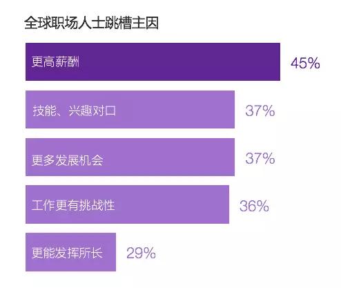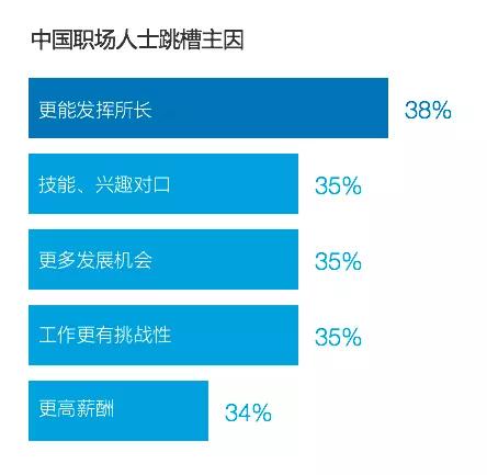 而在中国,推动职场人士换工作的首要因素,则是希望“更能发挥所长”。调研显示,个人技能和兴趣、发展机会乃至挑战性都比金钱更重要。