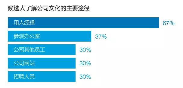 除此之外,用人经理也是公司文化的最佳代言人,他的行为举止很可能暗示了候选人今后工作的模式和环境,超过三分之二的候选人会将用人经理视作了解公司文化的最佳途径。