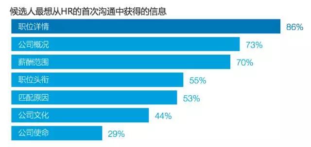 其中,在与HR的首次沟通中,职位详情、公司概况、薪酬范围是候选人最关心的信息。公司文化和使命虽然不是人们最先关心的内容,但在后续求职阶段中也将显示出重要性。