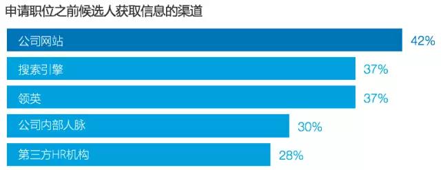 数据显示,候选人在申请职位前会从多渠道收集信息。公司网站是候选人前期收集信息的主要渠道,其次是领英和搜索引擎。如果要更好地了解职位详情,候选人也可能会询问现任员工。